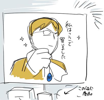 雑なくせに大きい絵ですみません。ジブリグッズを扱ってるお店で飛行石ペンダント売ってますよね。神戸のモザイクにもお店があって、そこの飛行石コーナーの宣伝イラストがムスカ大佐(↑)だったんですよ。作中の画をもとに誰かがイラストを描いたみたいですが、もう可笑しくて。撮影禁止だったので皆我慢したんですけど、「うそ、ここで買ったの!?」などツッコミが。大うけしたのに書き忘れてたので、追記しておきます。