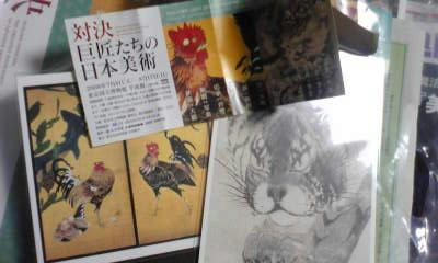いま上野でやっている対決展。前期にとっていた「東洋美術史」の先生が色々な美術展の招待券を配ってくれて、↑もその招待券で行ってきました(5枚位しかなかったので、リアペを速攻で書き上げて、友達の分と合わせて3枚かっぱらってきたのです)。私のお目当ては若冲でした。美術史の授業でもテーマがこの人だったので、是非ナマの絵を見てみたかったんです。広告にもよく出ていた「仙人掌群鶏図襖」、ニワトリをこんなに格好良く描けるのは凄いと思います。あと、ヒヨコも可愛かった。「旭日鳳凰図」もあって嬉しかったけど、見れば見るほどクラクラしました。艶っぽいですよ!他にも有名どころがごろごろしてて、本当に凄かったです…。人の数も…。平日にもかかわらず結構な人出でした。新聞でも広告凄かったから覚悟して行きましたが。これだけの人が来ると、マナー守らない人も増えるのが悩みです。ぶつかってもシカトしたり、説明書きをブツブツ読み上げてたり、大声で○○は下手ね!等と品評してたり…。それでも十分堪能したから良いのですが…。いつか権力を手にして美術館貸切!とかやってみたいですな