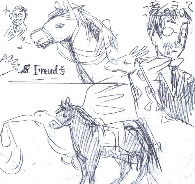 ゼミ発表終了記念に。レジュメをまとめていて煮詰まった時(しょっちゅうでしたが)描いたものです。この症例は当分忘れないです。忘れたくても忘れられそうにないですね。悩みすぎて夢にまで出てきたくらいなので…。ゼミで失敗したり、あとはケンタウロス=人馬が出てきて相手をしたり、何やってるんだか、といった夢でした。